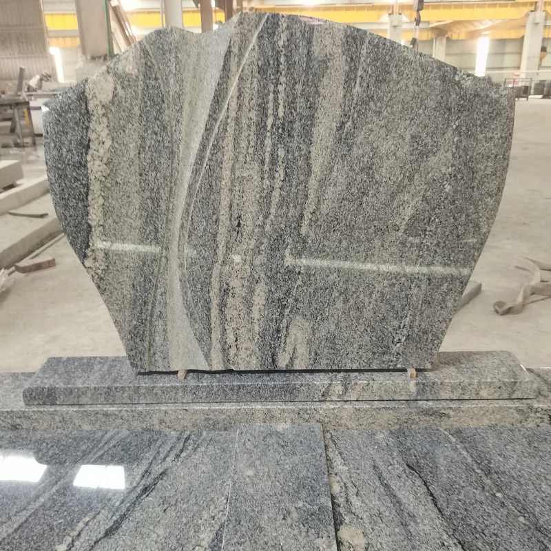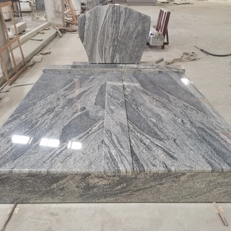 The China Juparana Double Hungary Tombstone uses China Juparana grey granite with natural linear wave patterns.