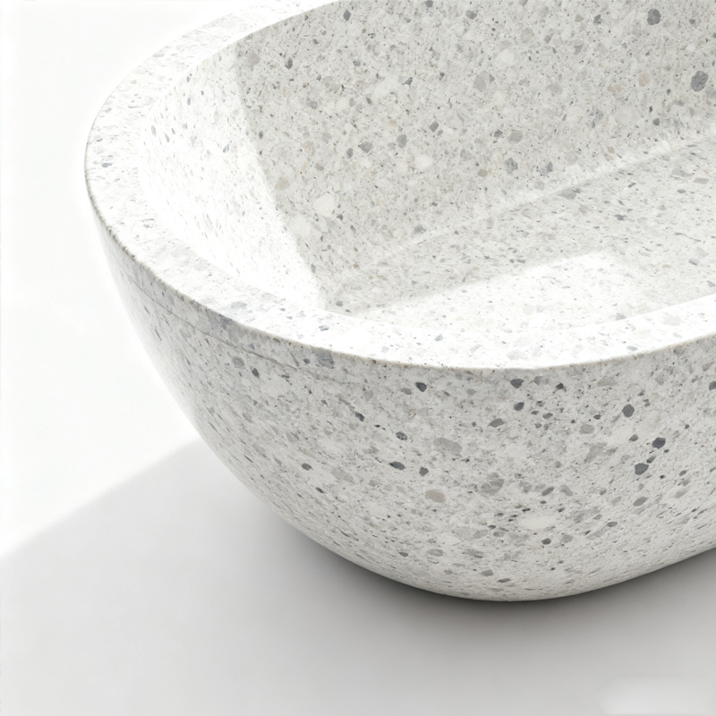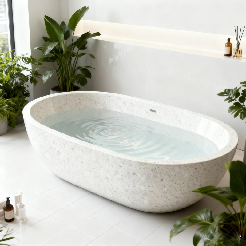 The terrazzo bathtub brings a unique aesthetic to modern bathrooms, where luxury meets practicality. Its smooth oval shape is designed to fit seamlessly into spacious bathrooms or spa-like environments, offering a serene and comfortable bathing experience.