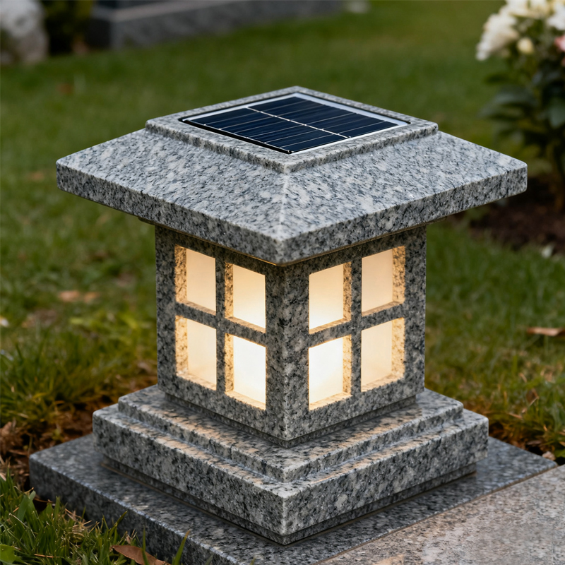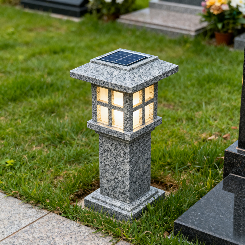 The Solar Lantern Granite Lamp for Cemetery combines the natural beauty of granite with modern solar technology. This lamp is designed to be a low-maintenance, eco-friendly lighting solution for cemeteries and memorial sites. The solar panels charge the lamp during the day, ensuring that it lights up automatically at dusk, creating a peaceful and respectful environment for visitors.