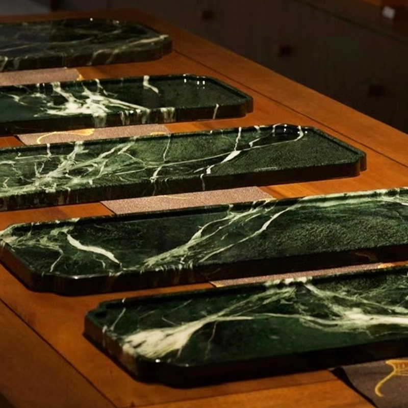 The Prada Green Marble Tea Tray exemplifies the evolving role of natural stone in luxury lifestyle design. Handcrafted by Songjia’s skilled artisans, each piece of marble is individually selected from premium blocks to ensure color uniformity and organic veining rhythm. The result is a visual composition of deep green undertones and ivory tracery — a texture reminiscent of haute couture fabric.