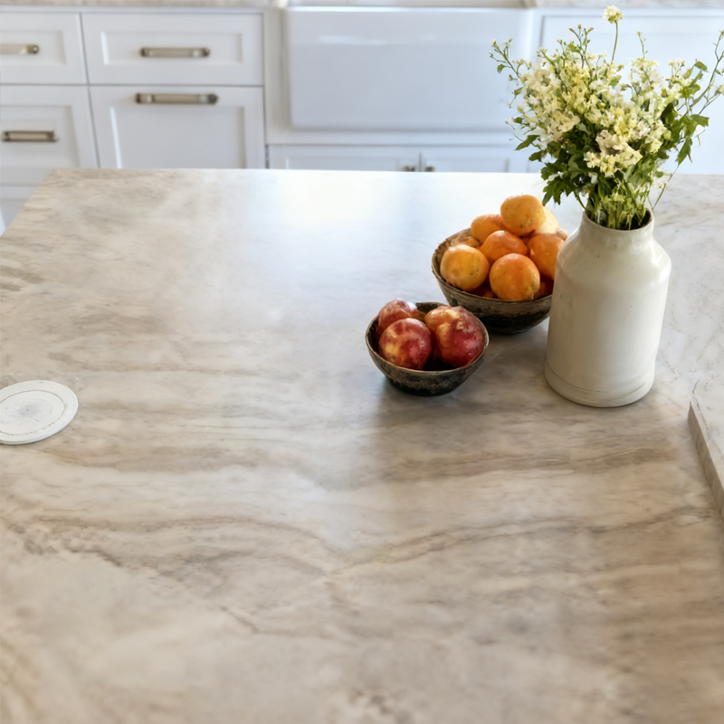 Taj Mahal quartzite is highly durable, resistant to heat, scratches, and stains, making it an ideal choice for high-use kitchen environments.
